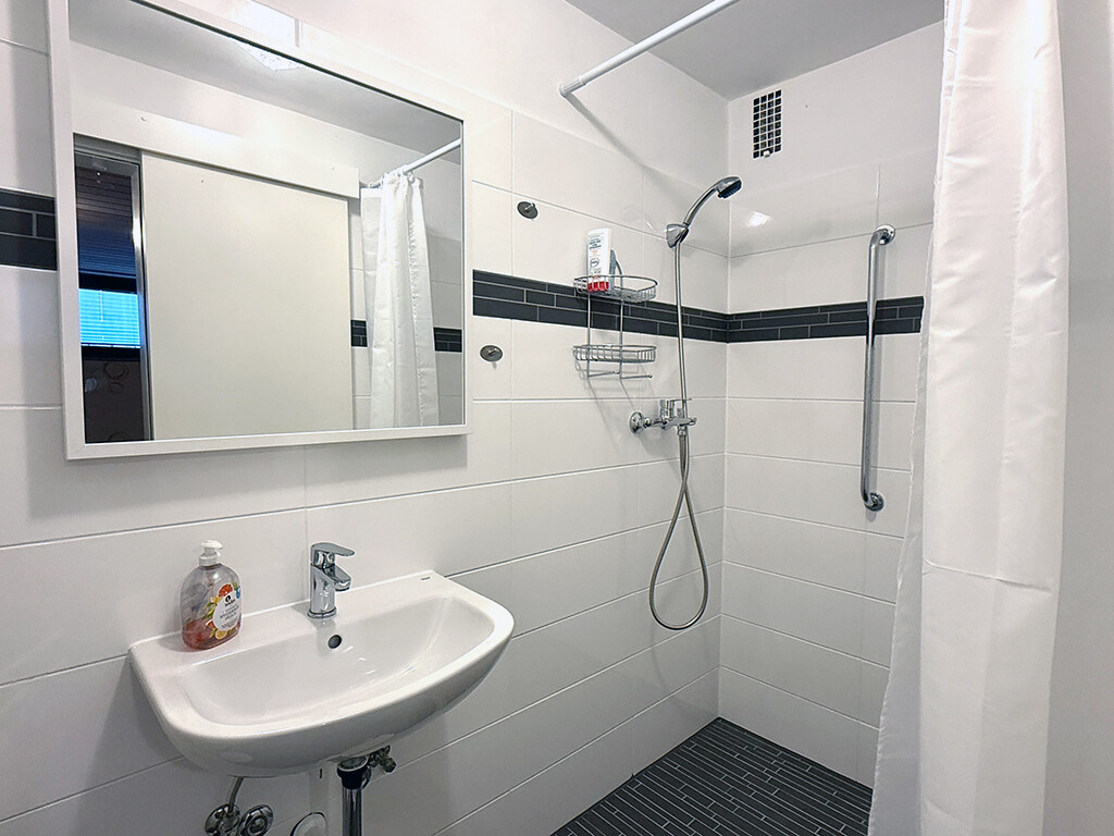 Der größere Raum (Grundriss III) verfügt über ein integriertes Bad mit Dusche und Waschbecken. Ebenfalls auf dieser Ebene sind der Hauswirtschaftsraum (Grundriss: Installationskeller) sowie ein weiterer Raum mit Zugang über die Kelleraußentreppe in den Garten.