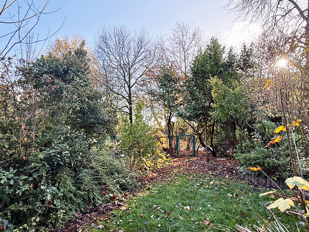 Zum Haus gehört eine Garage, die einen Zugang zur Terrasse hat. Im eingefriedeten Garten steht ein größeres Gartenhäuschen.