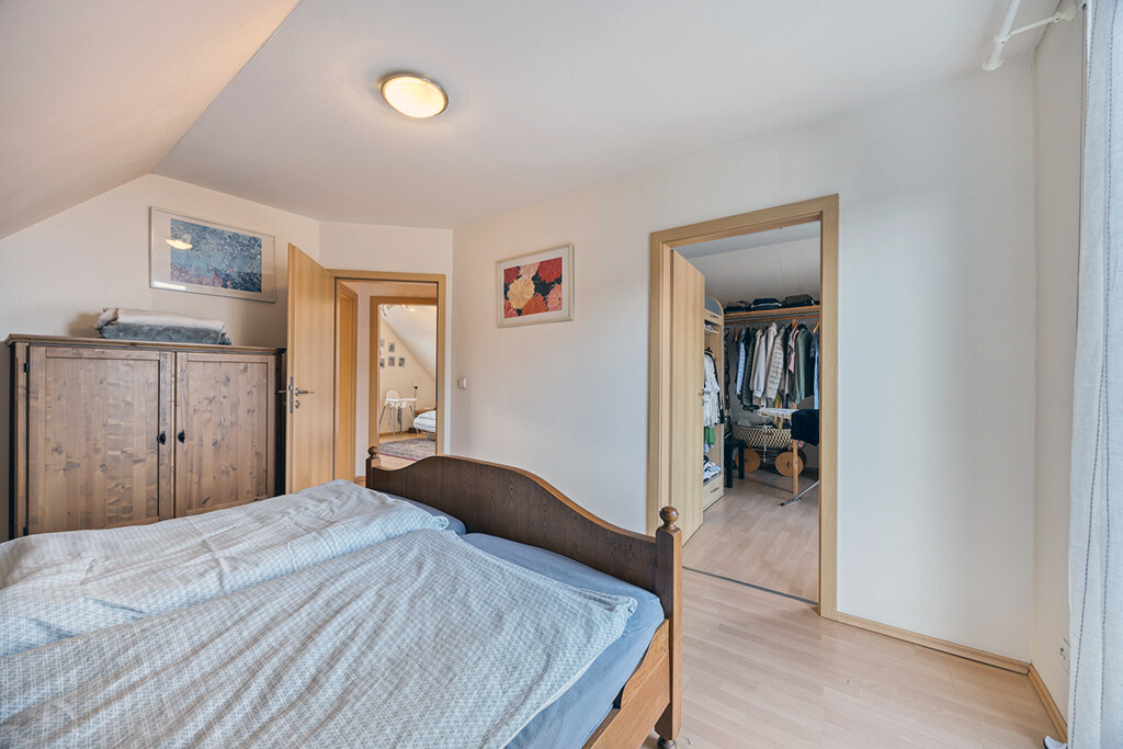 Dachgeschoss: Elternschlafzimmer (mit Ankleidebereich), Kinderzimmer, Bad (mit Wanne und Dusche), Flur