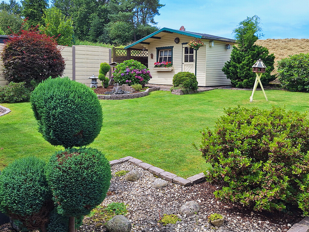 Der gepflegte Garten (mit halb eingelassenen Pool) lädt zum Verweilen und Entspannen ein. Ein Holzgartenhaus bietet zusätzlichen Stauraum für Gartenmöbel und -geräte.
