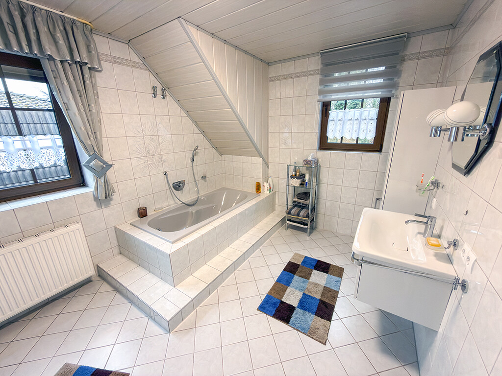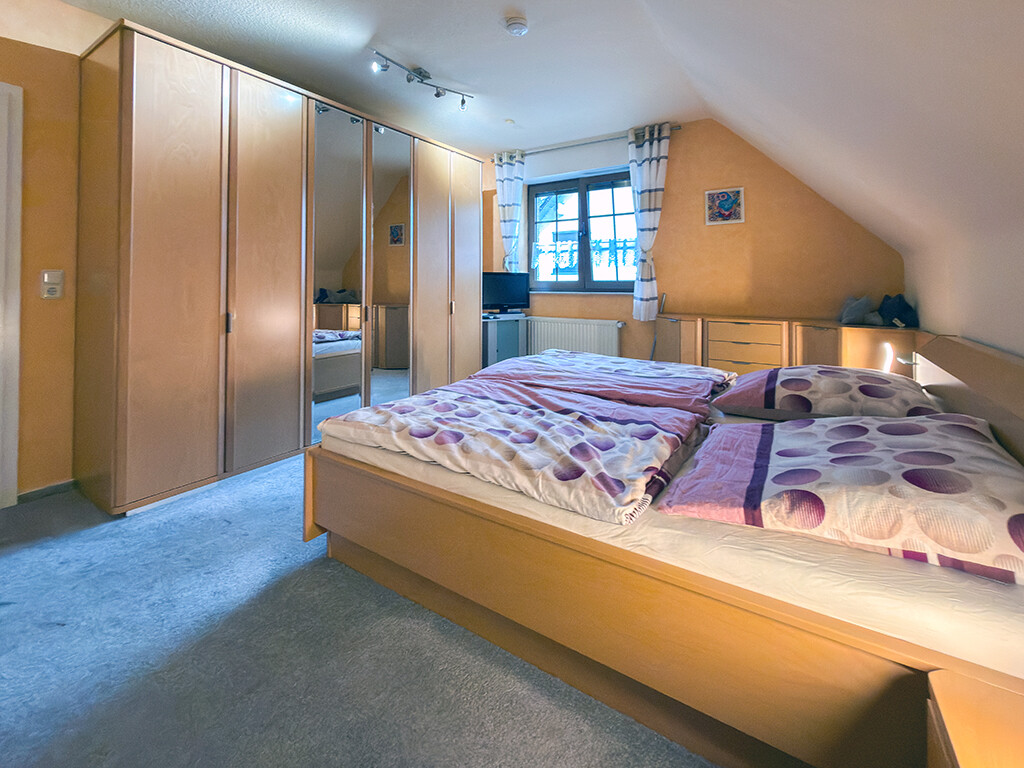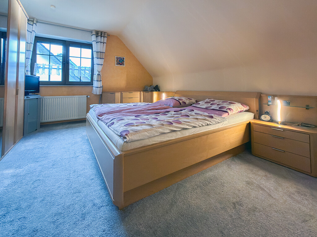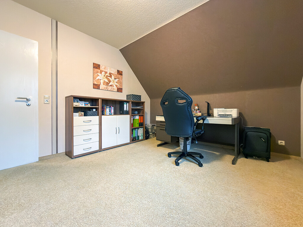 Dachgeschoss: Flur, Elternschlafzimmer, Kinderzimmer I, Kinderzimmer II (respektive Büro), Bad (mit Dusche, Wanne, WC und Waschbecken)