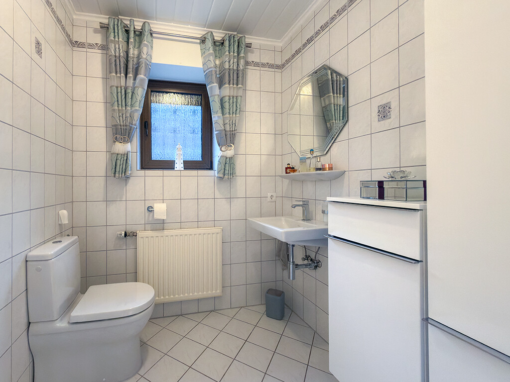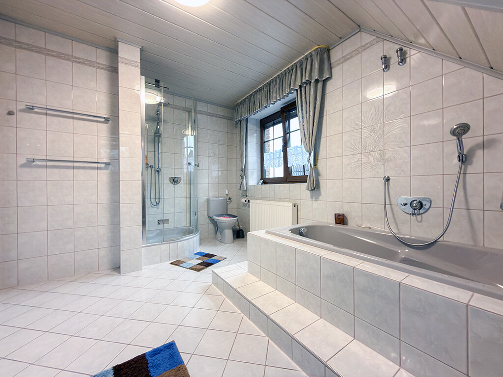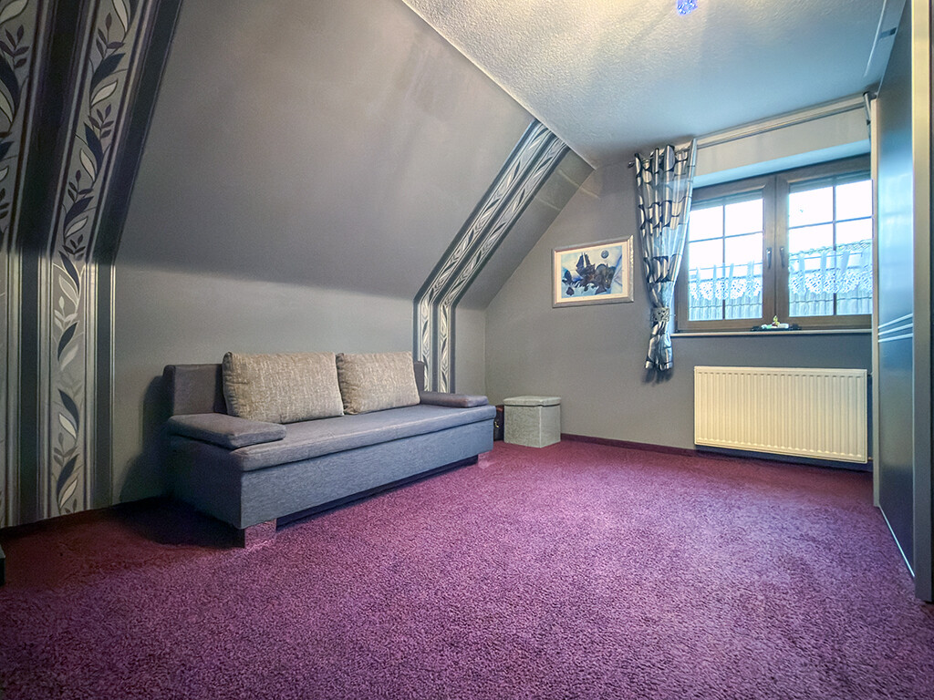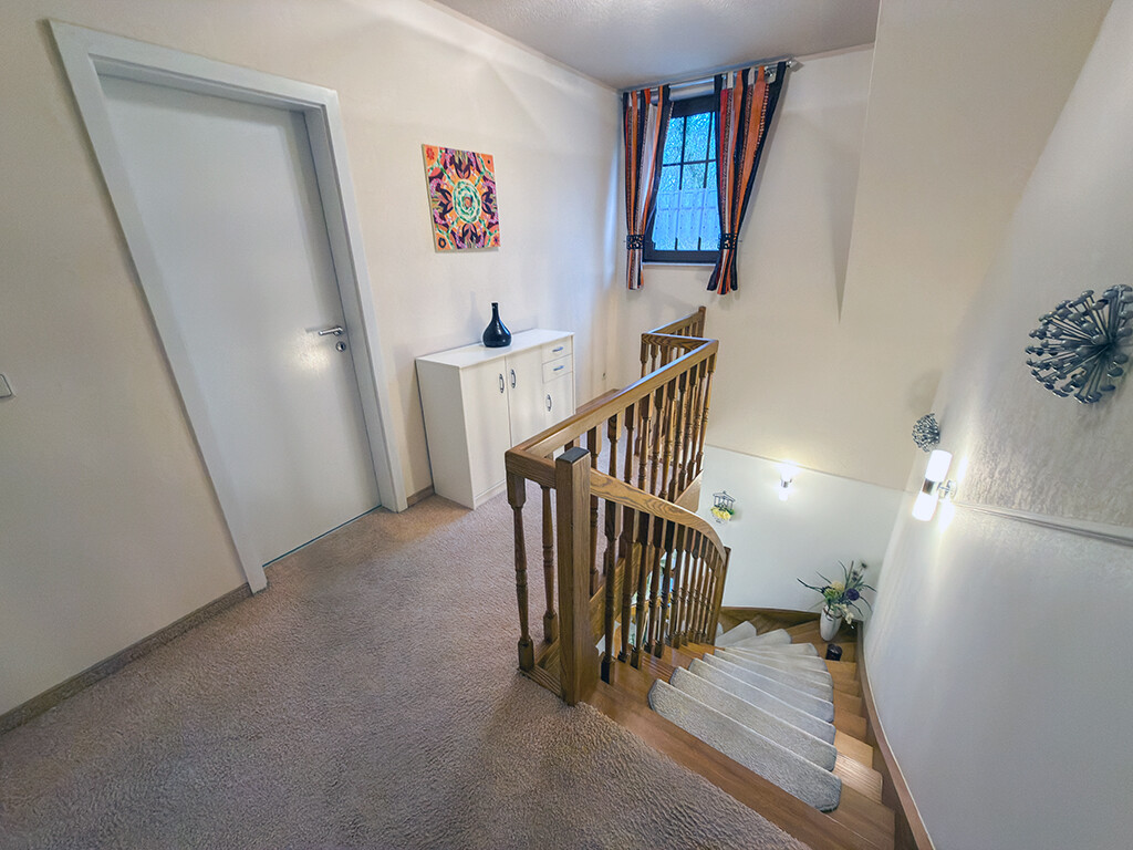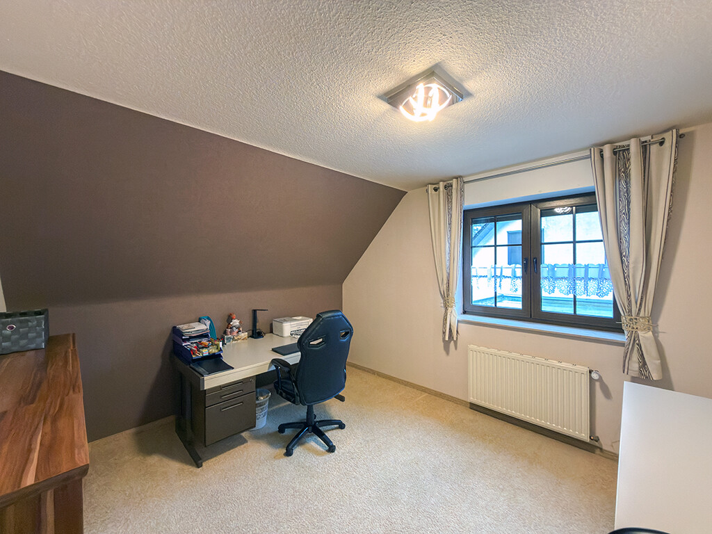 Dachgeschoss: Flur, Elternschlafzimmer, Kinderzimmer I, Kinderzimmer II (respektive Büro), Bad (mit Dusche, Wanne, WC und Waschbecken)
