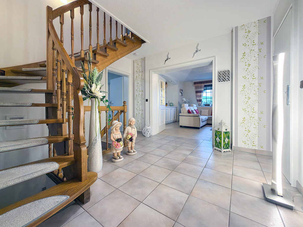 Erdgeschoss: Geräumige Diele (mit Garderobe und Kellerabgang), offenes Wohn- und Esszimmer (mit gemütlichem Erker und Zugang zur überdachten Terrasse), Küche, Gäste-WC