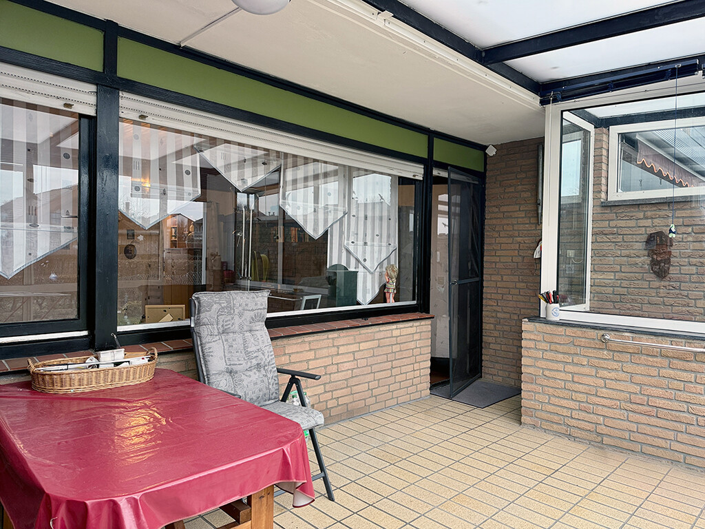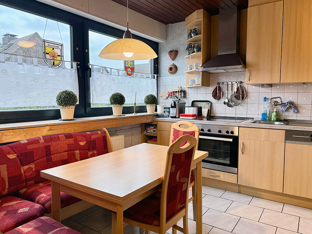 Im Erdgeschoss befinden sich das Gäste-WC, die großzügige Küche (mit Zugang zum Keller) sowie der Wohnbereich mit Zugang zur Terrasse, die überdacht und mit Fenstern in der Art eines Wintergartens umschlossen wurde, sowie zum südöstlich ausgerichteten Garten. Das Erdgeschoss ist mit Fliesen ausgestattet.