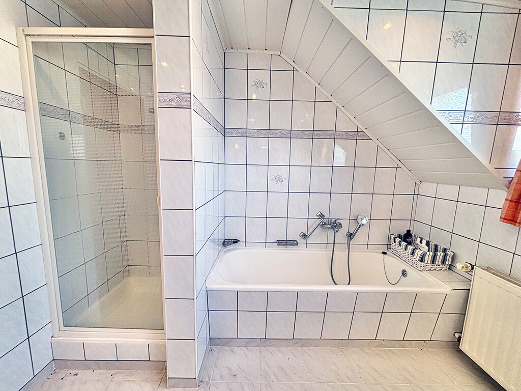 Erdgeschoss: Wohnzimmer, Schlafzimmer, Küche, Flur, Bad (mit Wanne und Dusche)