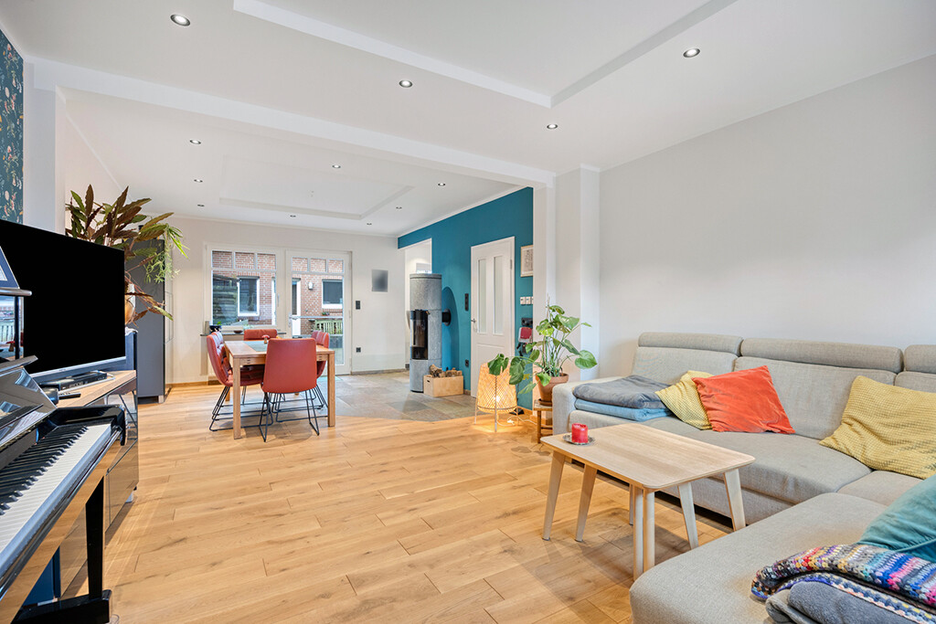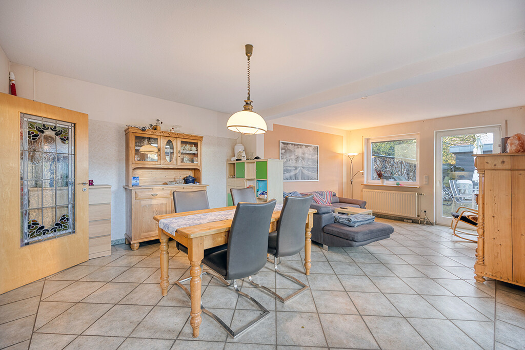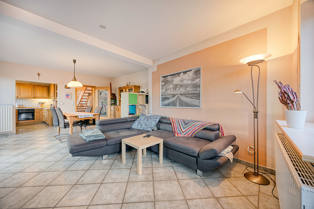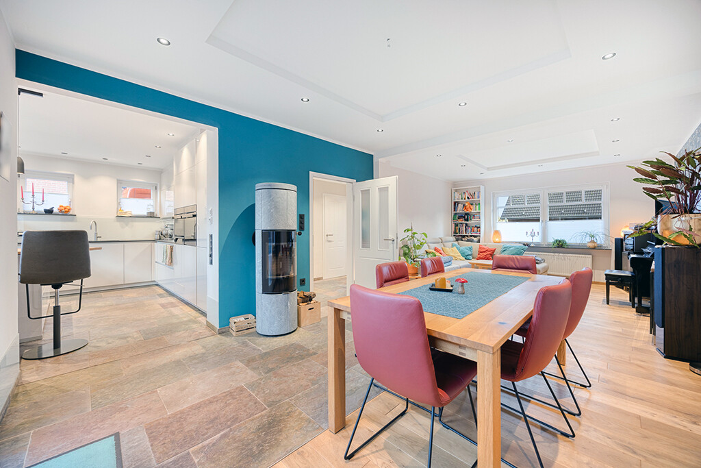 Erdgeschoss: Wohn- und Esszimmer mit Übergang in die angrenzende offene Küche, Diele, Gäste-WC, Arbeitszimmer