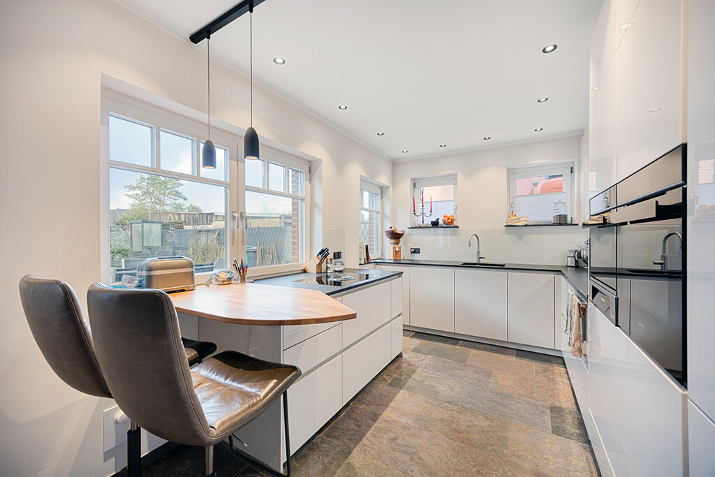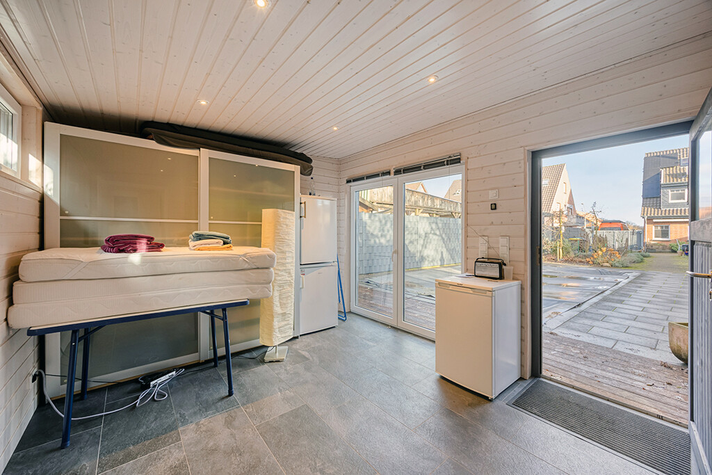 Das HINTERHAUS wurde um 1997 aus der ehemaligen Scheune und den Garagen errichtet. Mit ca. 104 m² Wohnfläche (nach unverbindlichem Aufmaß) bietet es vielseitige Nutzungsmöglichkeiten. Es verfügt über einen offenen Wohn- und Essbereich mit angrenzender Küche und ein Duschbad im Erdgeschoss sowie zwei Schlafzimmer und ein weiteres Bad im Dachgeschoss. Der gedämmte Spitzboden dient hier als Abstellfläche.