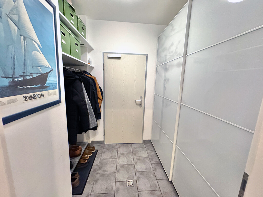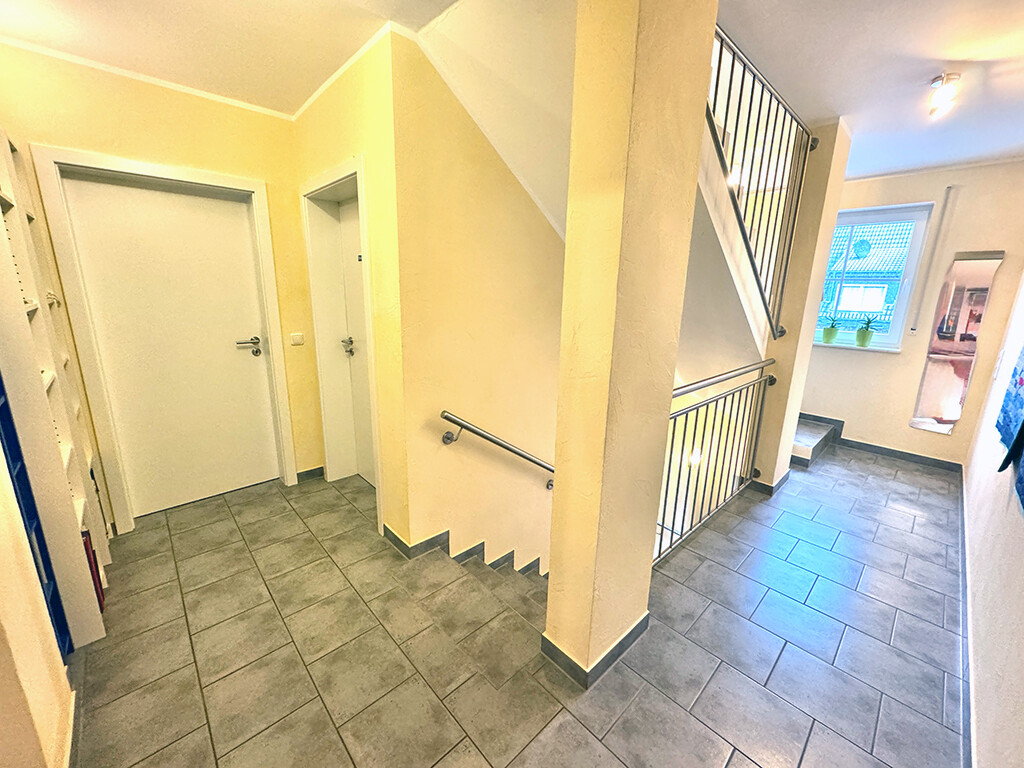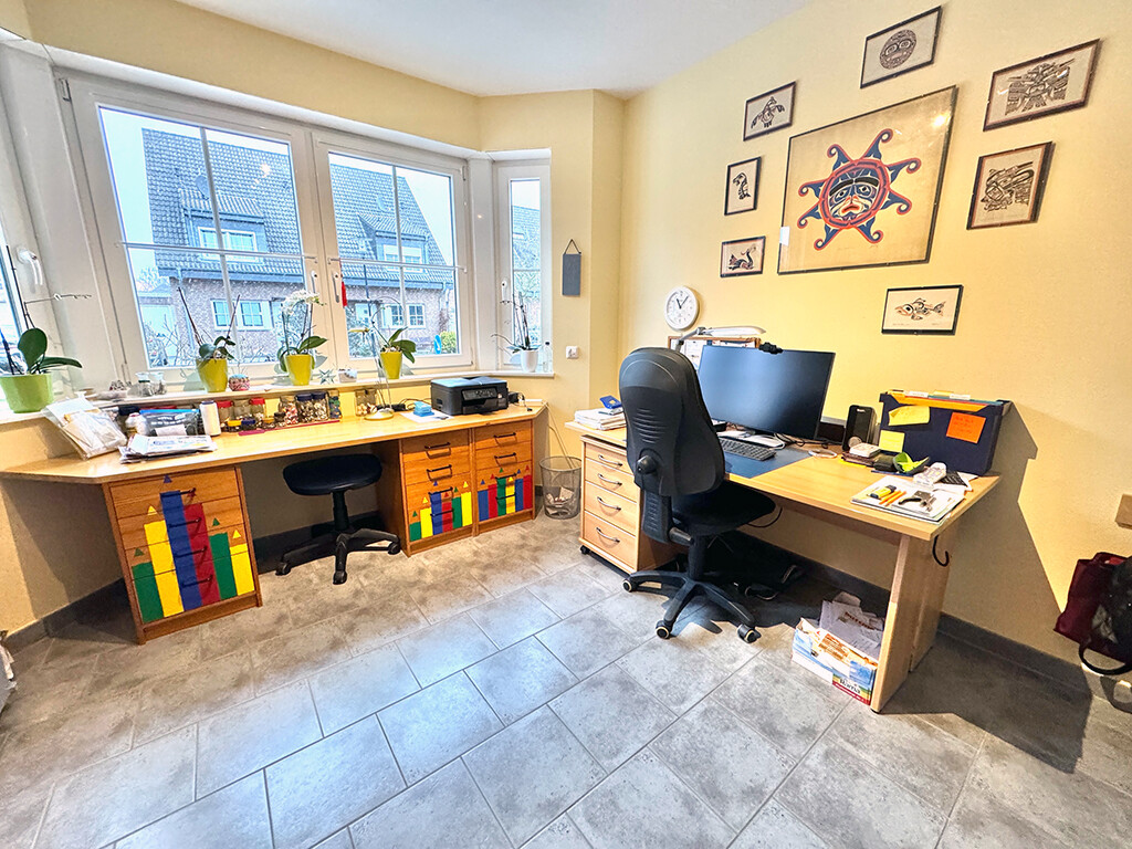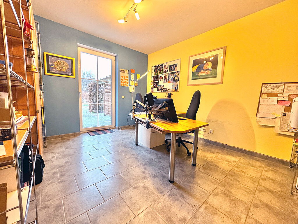 Erdgeschoss: Wohn- und Esszimmer (mit Terrassenzugang), Büro I, Büro II, Küche (inkl. Einbauküche nebst Elektrogeräten und angrenzendem Vorratsraum), Diele / Garderobe, Gäste-WC (mit ebenerdiger Dusche), Hausanschlussraum