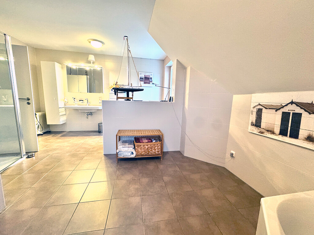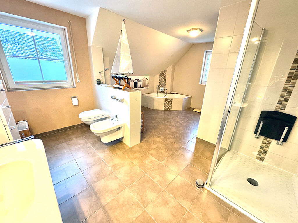 Obergeschoss: Elternschlafzimmer mit Balkonzugang und Bad "en Suite" (mit Sauna, ebenerdiger Dusche, WC, Bidet, Waschtisch und Wanne), Kinderzimmer I, Diele, Kinderbad (mit WC, Dusche und Waschtisch), Hauswirtschaftsraum