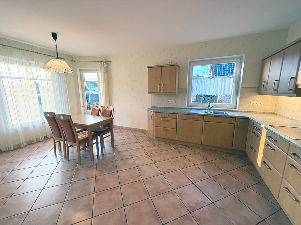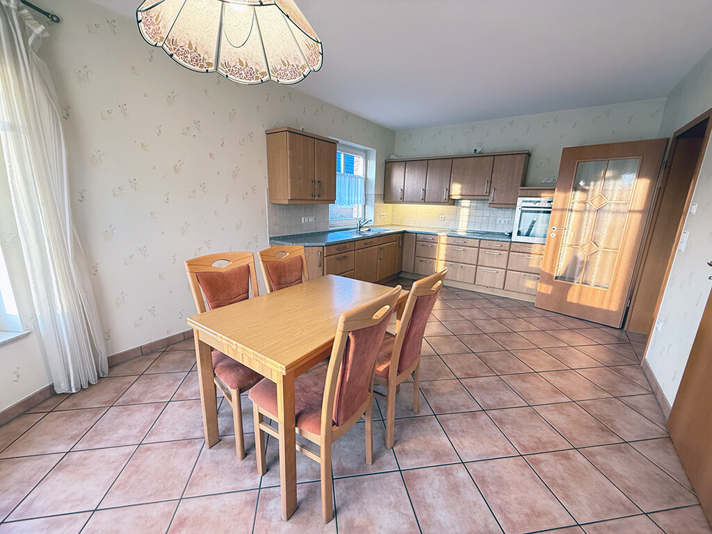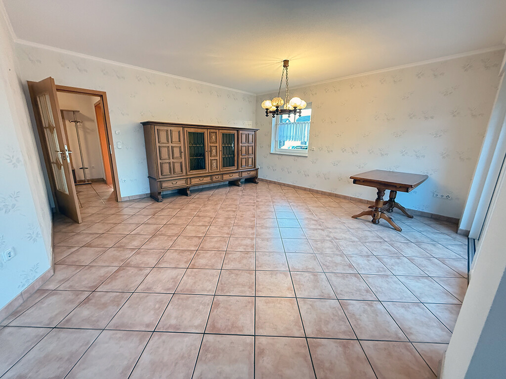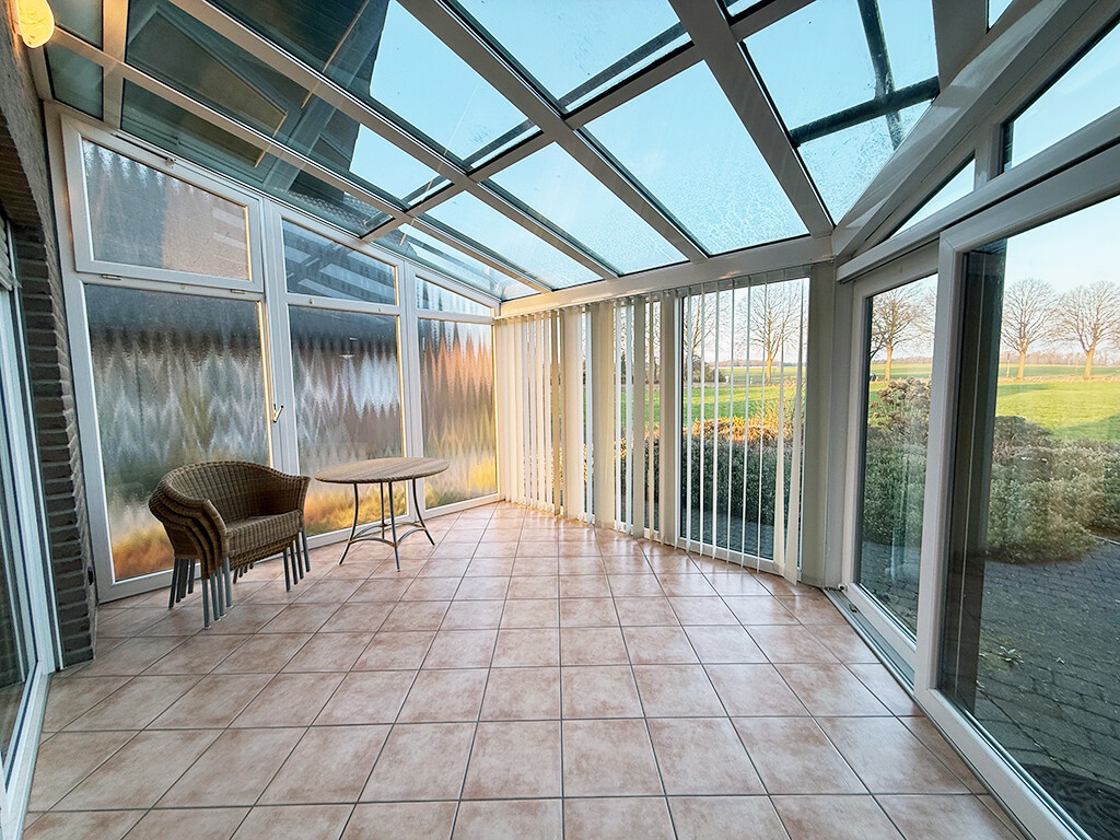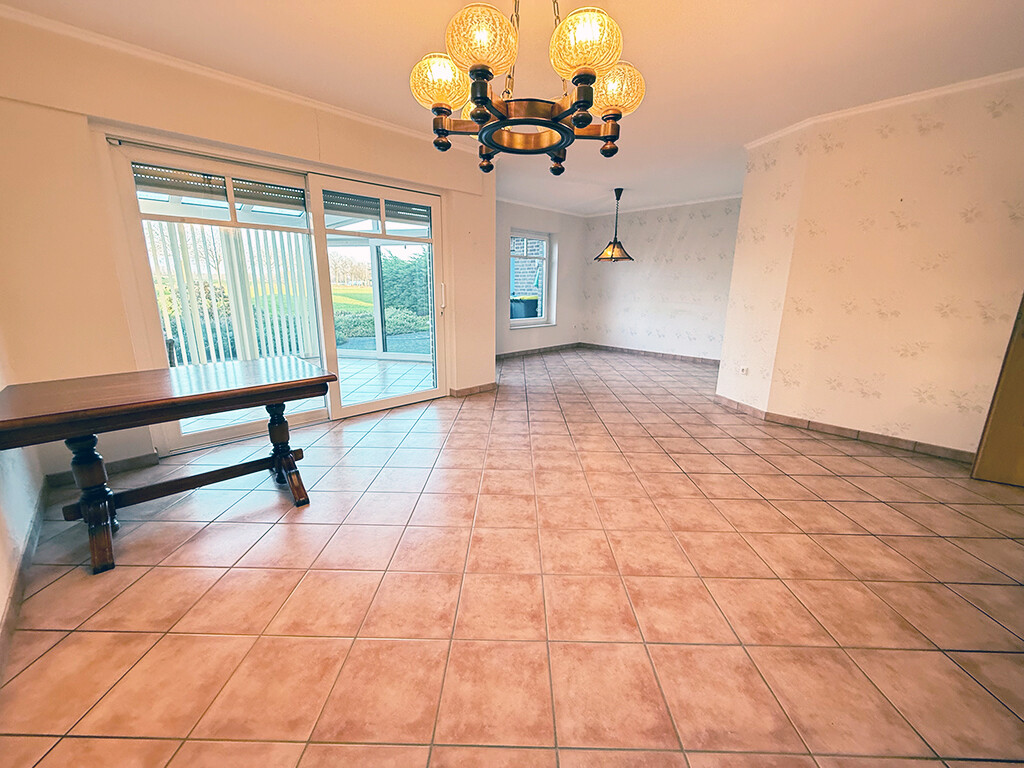 Das großzügige Wohn- und Esszimmer stellt den Mittelpunkt des Hauses dar und bietet ausreichend Platz und Stellmöglichkeiten. Mehrere Fensterelemente versorgen den Raum mit Tageslicht. Von hier gelangen Sie in den Wintergarten, der einen herrlichen Weitblick über die typisch niederrheinischen Wiesen und Felder bietet.