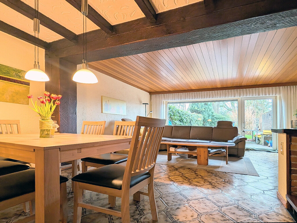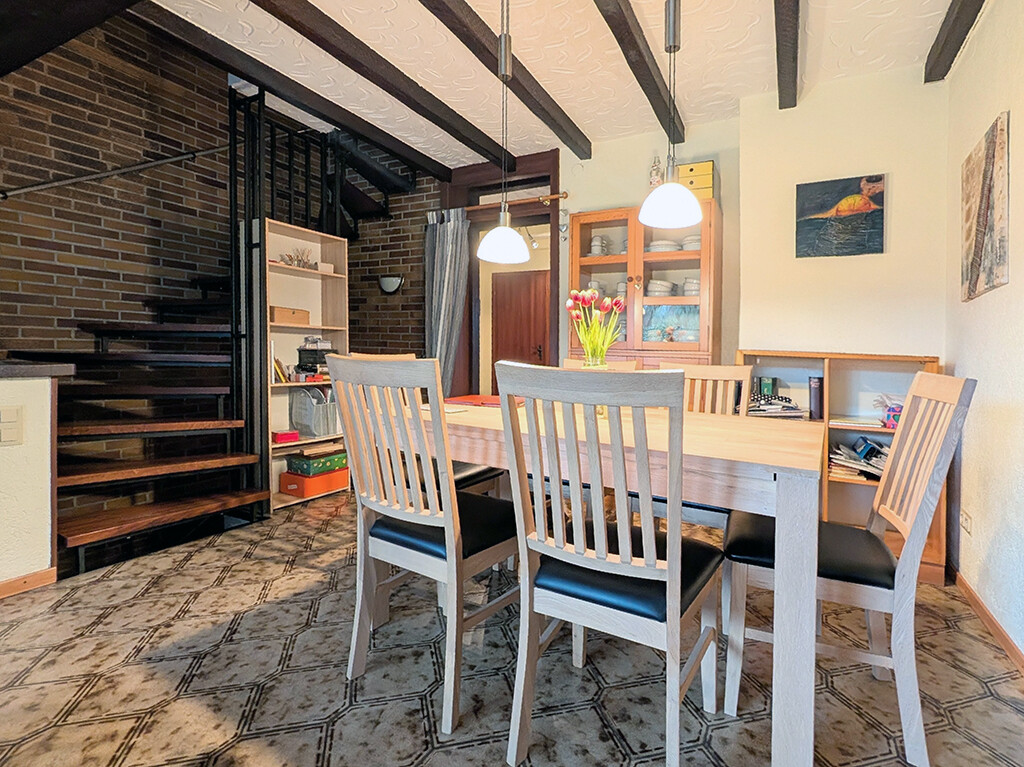 Im Erdgeschoss gelangen Sie über die Diele in die Küche, zum Gäste-WC sowie zum Wohn- und Esszimmer. Der offen gestaltete Wohn- und Essbereich bildet das Herzstück des Hauses. Sichtbare Deckenbalken, ein charaktervoller Fliesenboden und eine offene Holz-Metall-Treppe verleihen dem Raum eine warme und individuelle Atmosphäre. Vom Wohn- und Esszimmer aus haben Sie direkten Zugang zur Terrasse und in den Garten, der zum Entspannen und Verweilen einlädt.