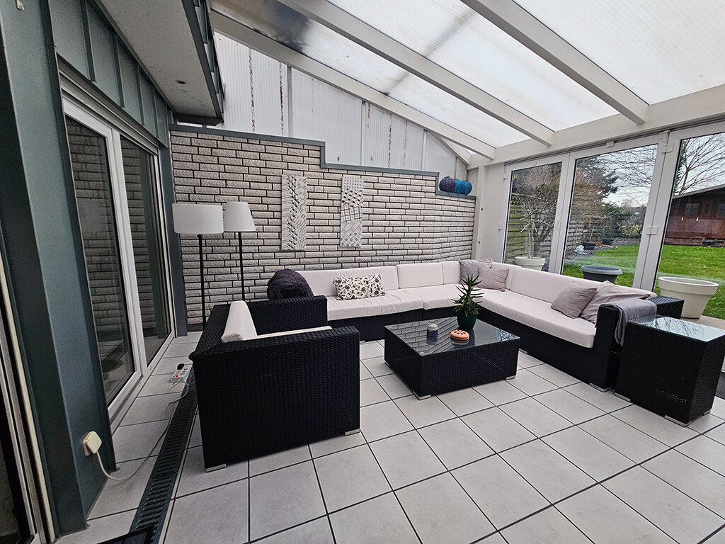 Im Außenbereich stehen eine überdachte Terrasse sowie ein Gartenhaus zur Verfügung.