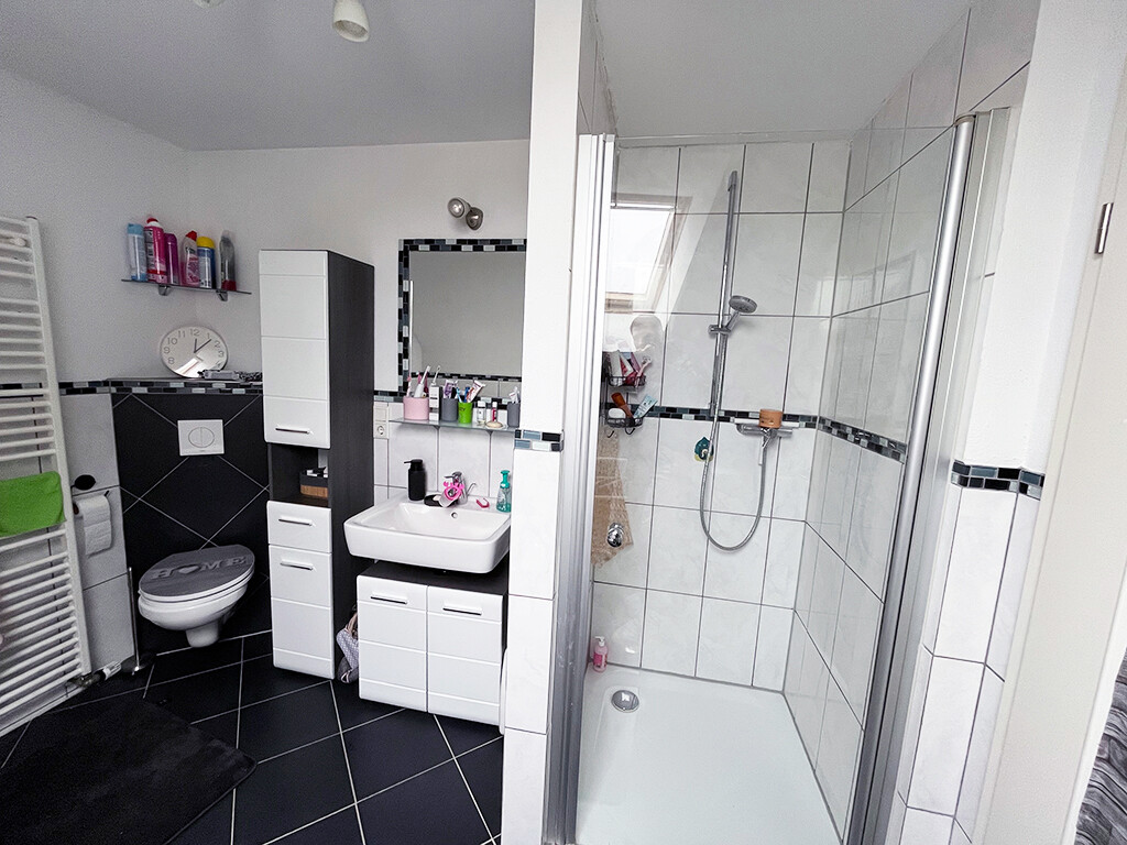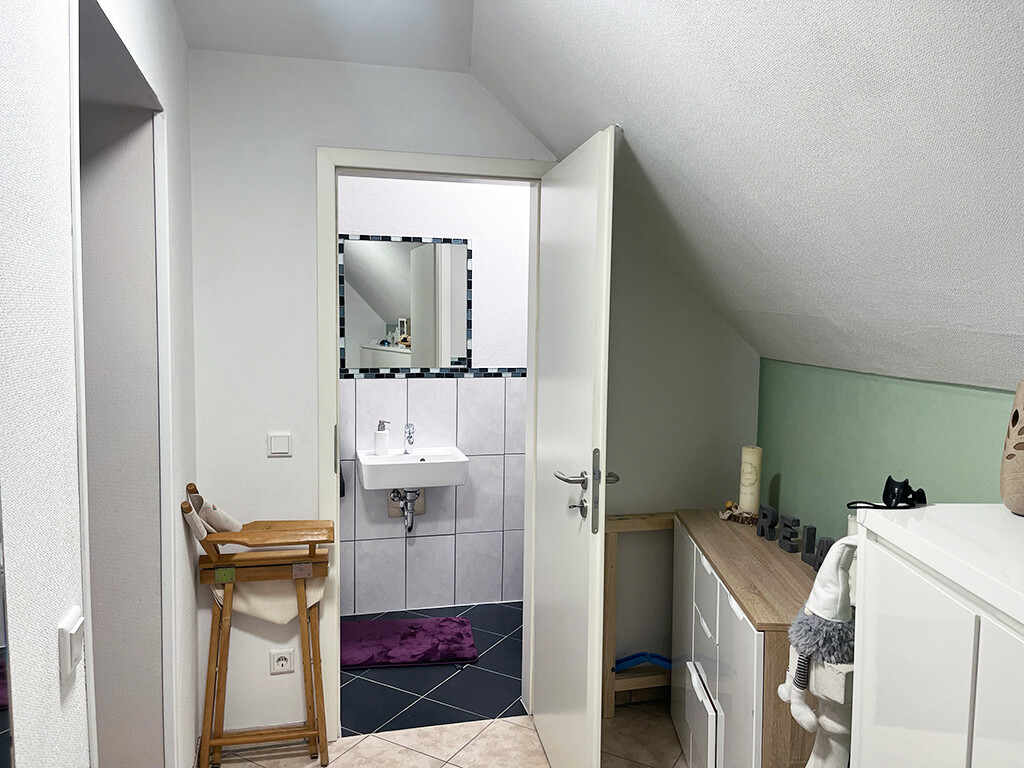 Dachgeschoss: Wohnung (ca. 104 m²): Wohn- und Esszimmer mit offener Küche und Balkonzugang, Schlafzimmer, Kinderzimmer, Büro, Flur, Bad (mit Dusche), Gäste-WC, Hauswirtschaftsraum