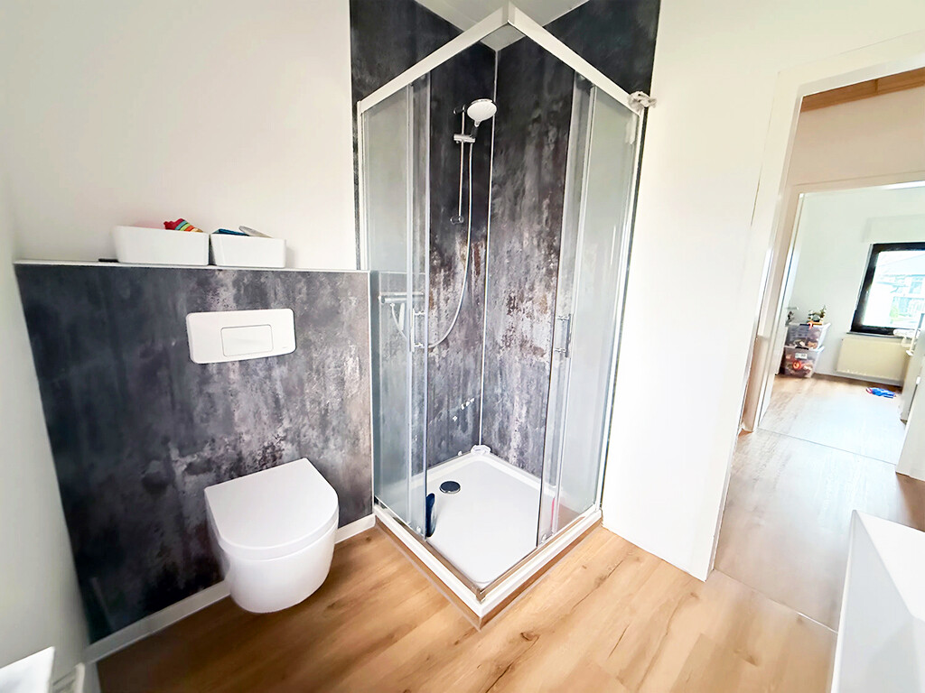 Obergeschoss: Elternschlafzimmer, Kinderzimmer, Büro (Durchgangszimmer), Flur, Duschbad