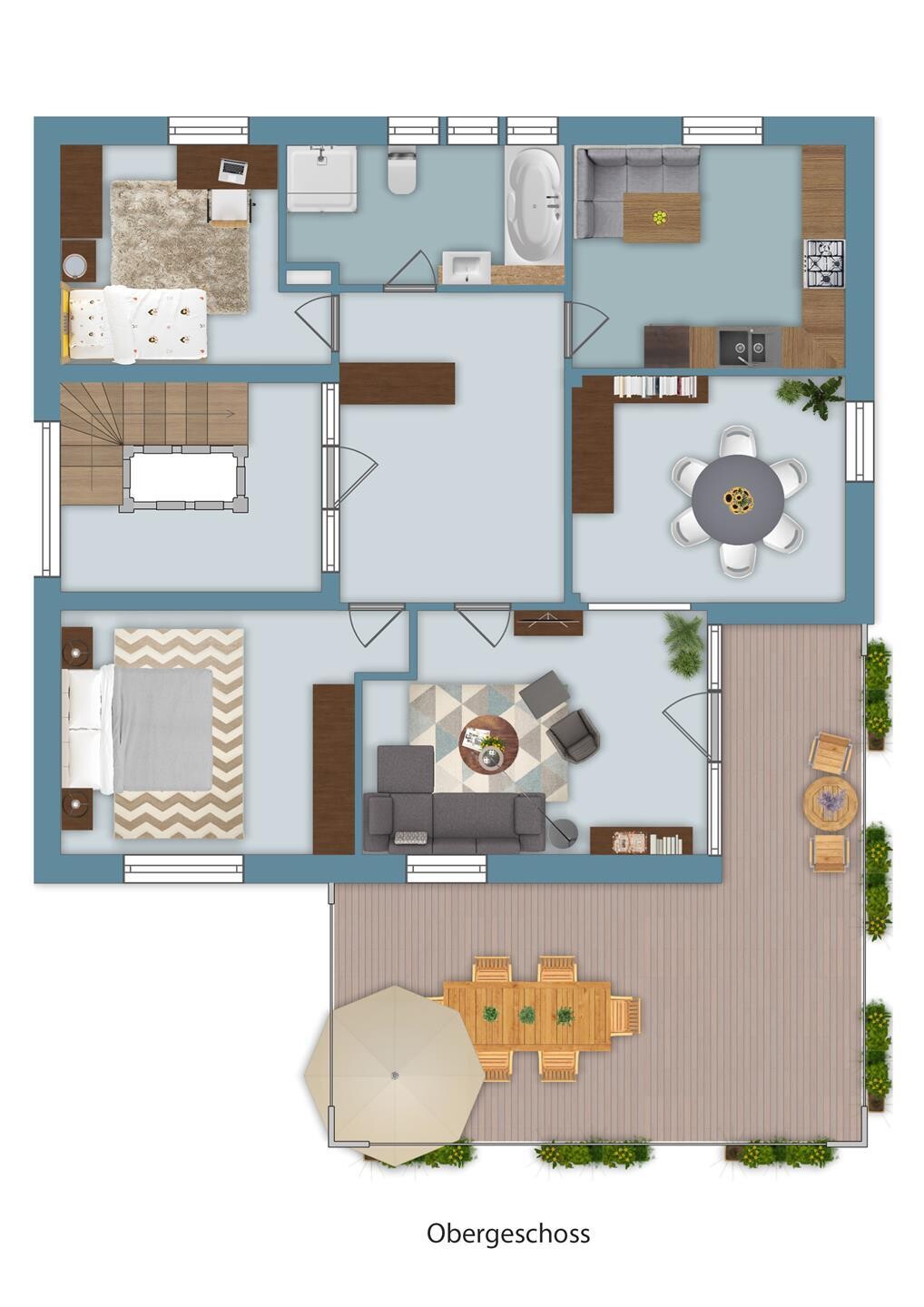 Obergeschoss (ca. 100 m²): Wohn- und Esszimmer (mit Zugang zur Dachterrasse), Schlafzimmer, Kinderzimmer, Küche, Diele, Bad (mit Dusche und Wanne)
