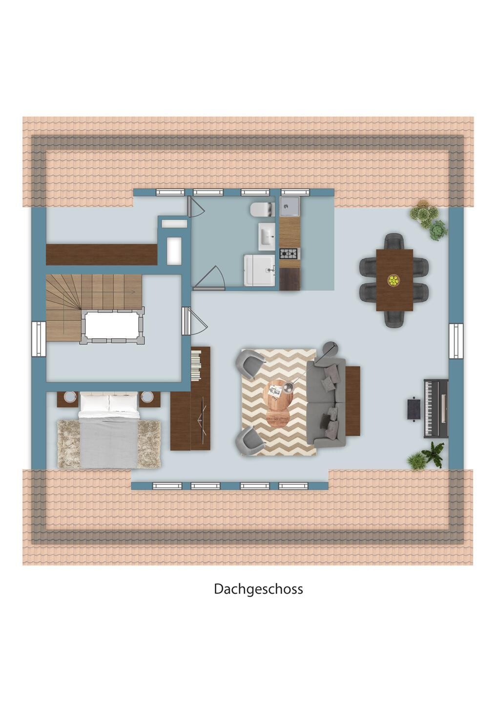 Dachgeschoss (ca. 77 m²): Offener Wohn-, Ess-, Koch- und Schlafbereich, Diele, Bad (mit Dusche)