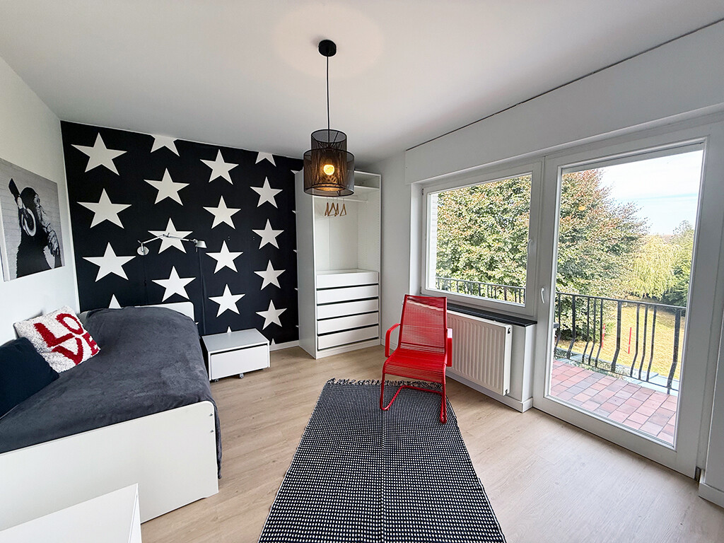 Obergeschoss: Elternschlafzimmer (mit Balkonzugang), Kinderzimmer I (ebenfalls mit Balkonzugang), Kinderzimmer II, Flur, Bad (mit Dusche)