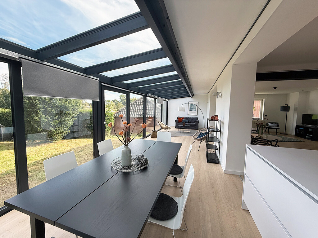Erdgeschoss: Wohn- und Esszimmer, Büro, Küche, Diele / Garderobe / Flur, Bad (mit Wanne), Vorratsraum, wintergartenähnlicher Terrassenanbau