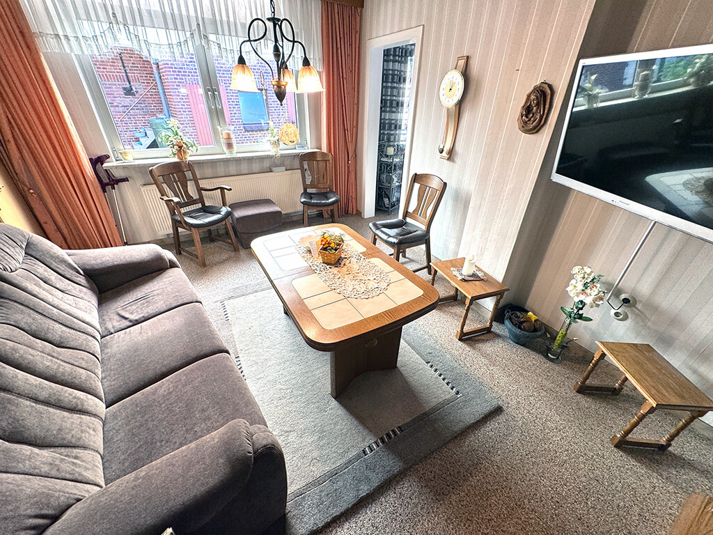 Erdgeschoss: Wohnzimmer, Esszimmer, Küche (inklusive Einbauküche und separatem Essplatz), Flur (mit Durchgang zum teilüberdachten Innenhof) sowie Heizungs- und Lagerraum