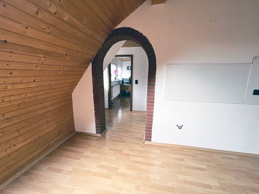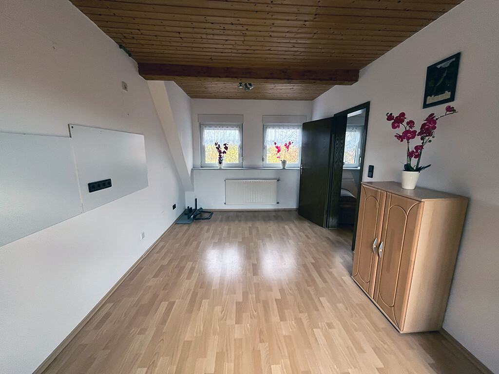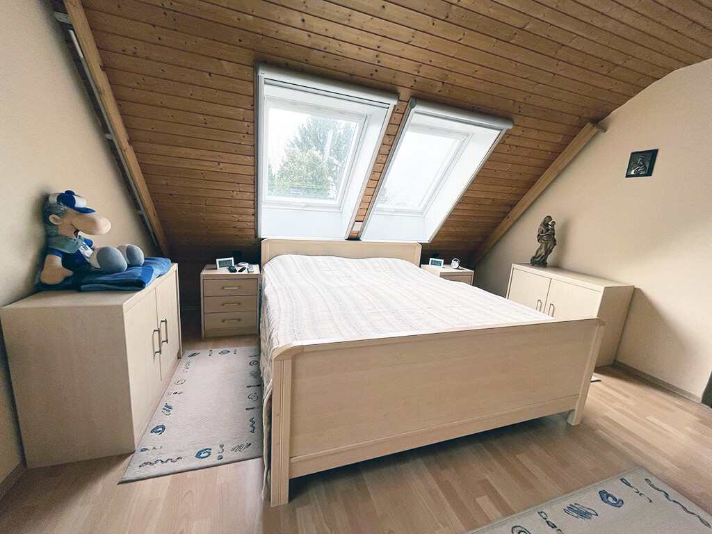 Dachgeschoss: Elternschlafzimmer, Kinderzimmer I, Kinderzimmer II (respektive Büro), Flur, Bad (mit Dusche) und Balkon